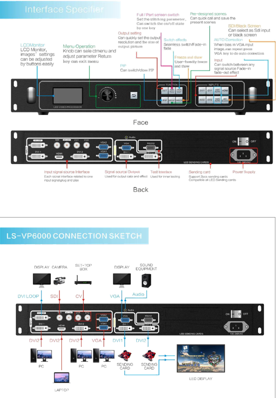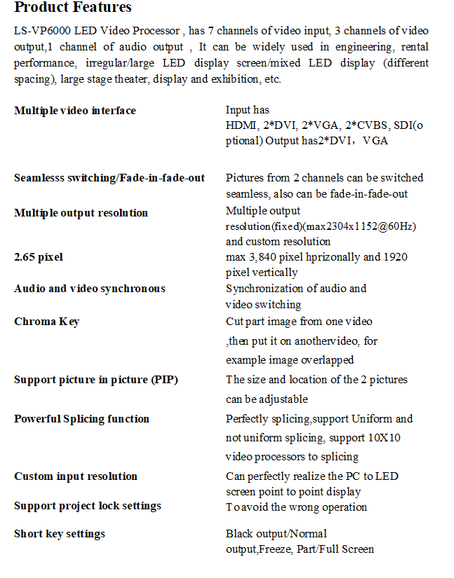 1. LS-VP6000 LED Video Processor , has 6 channels of video input, 3 channels of video output,1 channel of audio output.