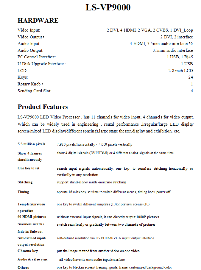 1. LS-VP9000 LED Video Processor , has 6 channels of video input, 3 channels of video output,1 channel of audio output.